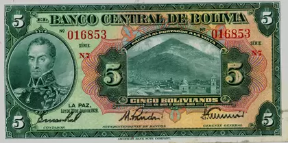 Боливия. 5 боливиано 1928 года. Симон Боливар. Состояние - прессовое.