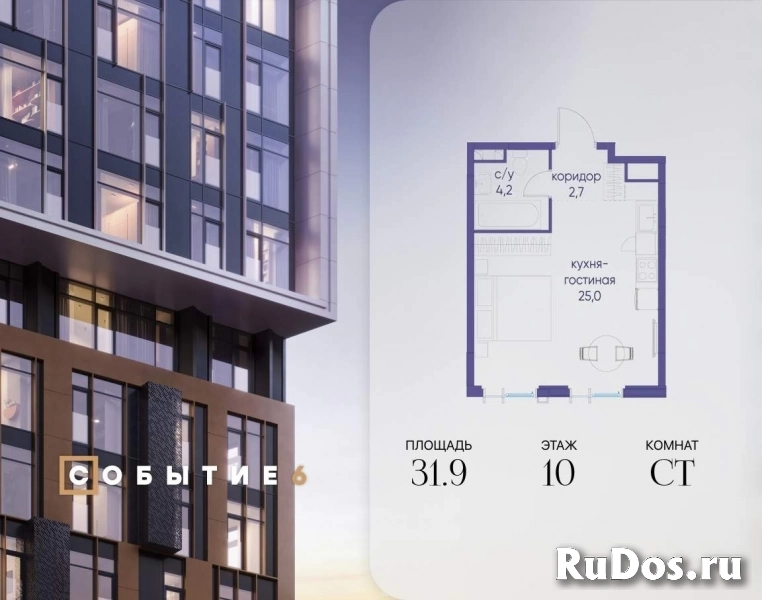 Продаётся квартира-студия от застройщика: общая площадь 31.90 м, жилая 20.00 м, кухня 5.00 м, 10-й этаж, жилой квартал «Событие-6», корпус 2 (секция 4) Срок сдачи: 4 квартал 2029 года.