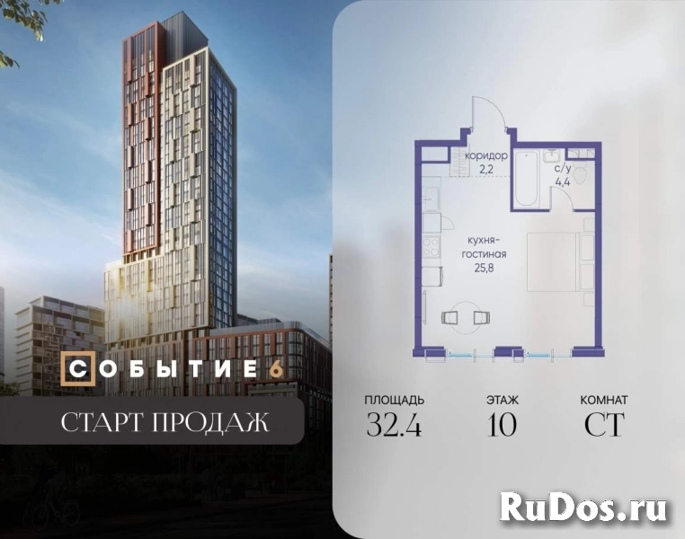 Продаётся квартира-студия от застройщика: общая площадь 32.40 м, жилая 20.80 м, кухня 5.00 м, 10-й этаж, жилой квартал «Событие-6», корпус 2 (секция 4) Срок сдачи: 1 квартал 2029 года.
