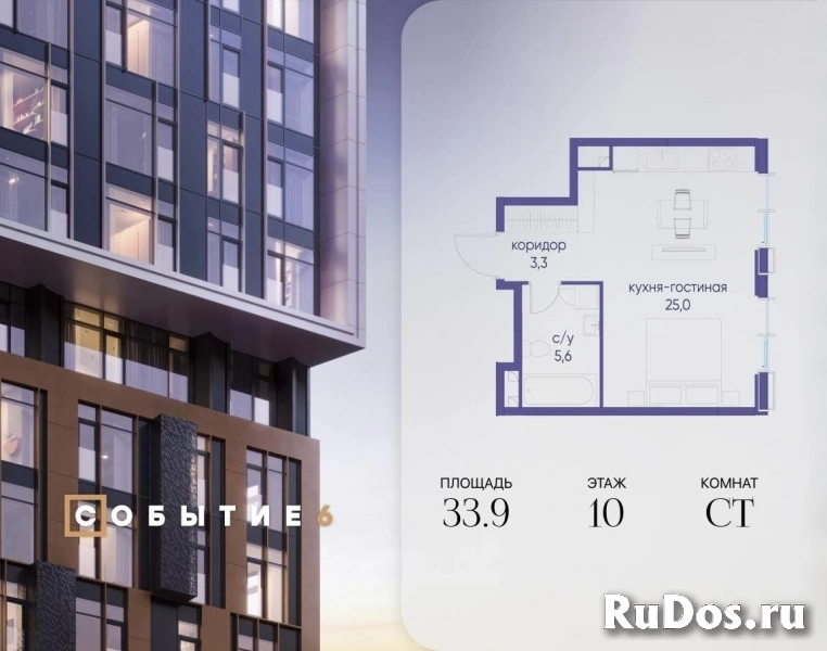 Продаётся квартира-студия от застройщика: общая площадь 33.90 м, жилая 20.00 м, кухня 5.00 м, 10-й этаж, жилой квартал «Событие-6», корпус 2 (секция 2) Срок сдачи: 4 квартал 2029 года.