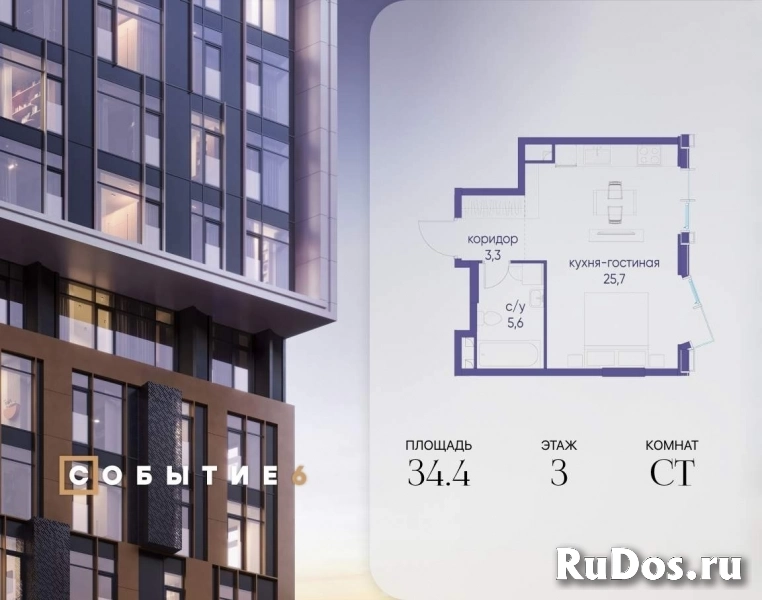 Продаётся квартира-студия от застройщика: общая площадь 34.40 м, жилая 20.70 м, кухня 5.00 м, 3-й этаж, жилой квартал «Событие-6», корпус 2 (секция 2) Срок сдачи: 4 квартал 2029 года.