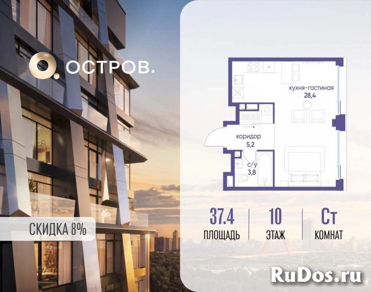 Продаётся квартира от застройщика: общая площадь 37.40 м, жилая 23.40 м, кухня 5.00 м, 10-й этаж, жилой квартал «Остров 12», корпус 1 (секция 1) . Срок сдачи: 1 квартал 2029 года.