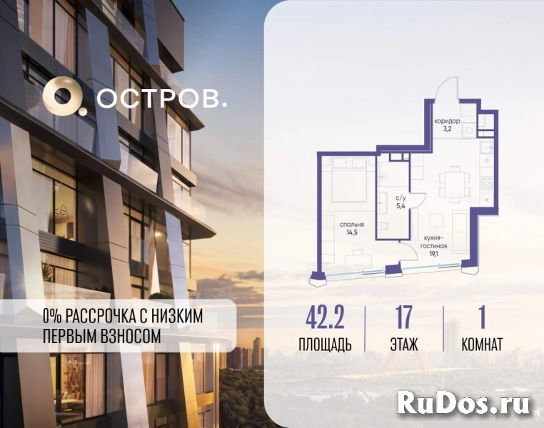 Продаётся 1-комн. квартира от застройщика: общая площадь 42.20 м, жилая 14.50 м, кухня 19.10 м, 17-й этаж, жилой квартал «Остров 12», корпус 2 (секция 1) . Срок сдачи: 1 квартал 2029 года.