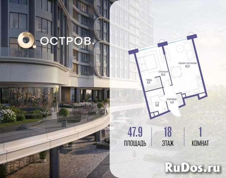 Продаётся 1-комн. квартира от застройщика: общая площадь 47.90 м, жилая 12.60 м, кухня 22.20 м, 18-й этаж, жилой квартал «Остров 7», корпус 7 (секция 2) . Срок сдачи: 3 квартал 2028 года.