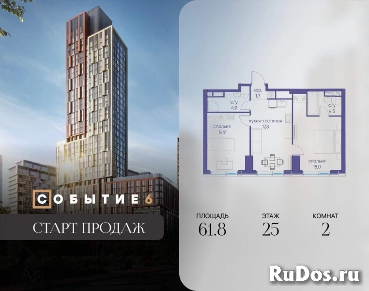 Продаётся 2-комнатная квартира от застройщика: общая площадь 61.80 м, жилая 32.90 м, кухня 17.80 м, 25-й этаж, жилой квартал «Событие-6», корпус 2 (секция 5) Срок сдачи: 1 квартал 2029 года.
