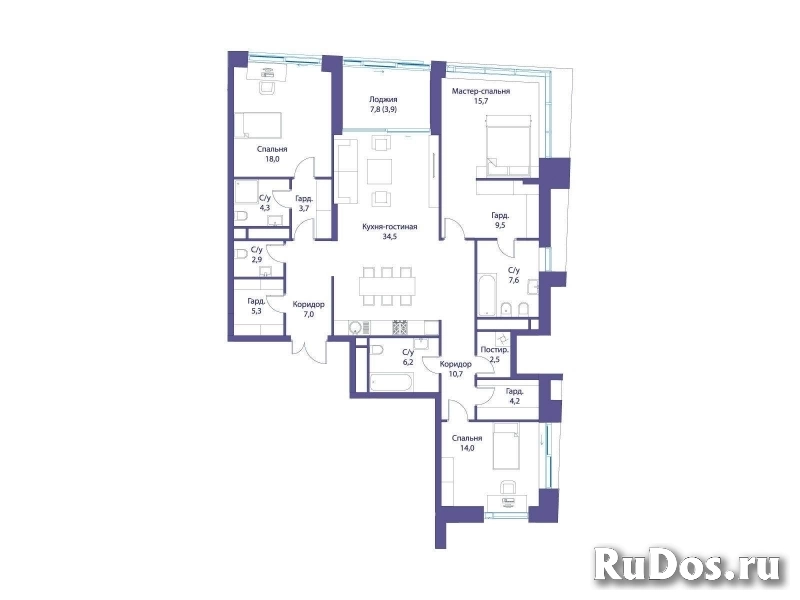 В квартире продуманная функциональная планировка с просторной кухней 34.50 м2. Жилая площадь - 57.20 м2. Высота потолка от 3,65 м. Изолированные комнаты, 4 санузла(1 раздельный и 3 совмещенных) . Окна на противоположные стороны. Виды на природный парк и реку.