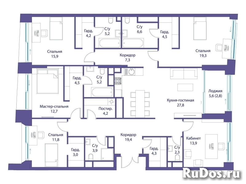В квартире продуманная функциональная планировка с просторной кухней 27.80 м2. Жилая площадь - 73.60 м2. Высота потолка от 3,65 м. Изолированные комнаты, 5 санузлов(1 раздельный и 4 совмещенных) . Окна на смежные стороны. Виды на природный парк и реку.