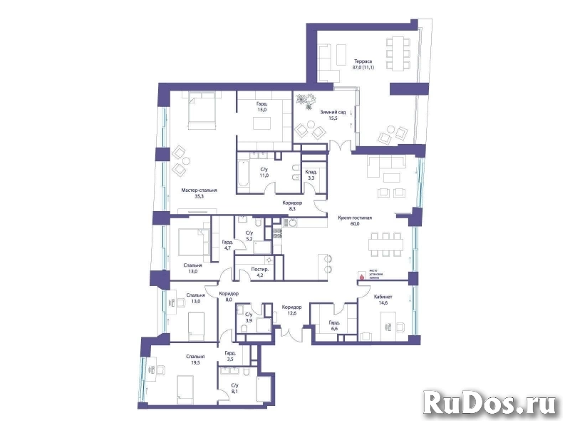 В квартире продуманная функциональная планировка с просторной кухней 60.00 м2. Жилая площадь - 110.90 м2. Высота потолка от 3,65 м. Изолированные комнаты, 4 совмещенных санузла. Окна на смежные стороны. Виды на природный парк и реку.