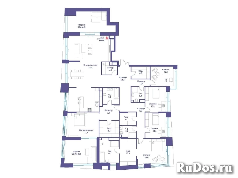 В квартире продуманная функциональная планировка с просторной кухней 71.00 м2. Жилая площадь - 81.80 м2. Высота потолка от 3,65 м. Изолированные комнаты, 4 совмещенных санузла. Окна на три стороны света. Виды на природный парк и реку.