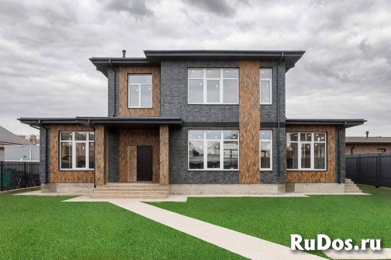 Фасад дома сделан из глиняной клинкерной плитки. Крыша мягкая черепица. Установлен забор по всему периметру из штакетника, автоматические ворота, калитка, площадка для двух машин.