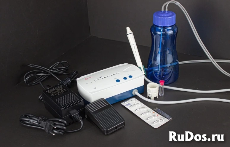 Уникальной особенностью данного скалера является наличие встроенного насоса и специального резервуара для воды в комплекте, что позволяет использовать скалер без стоматологической установки.