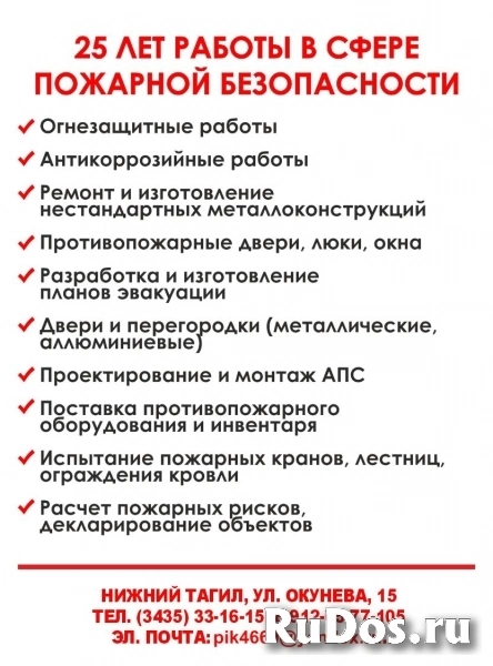 Разработка планов эвакуации,огнезащитные работы, поставка противопожарного инвентаря, противопожарные двери, люки и окна,испытание и ремонт пожарных лестниц и кранов, монтаж АПС, расчёт пожарных рисков, антикоррозийные работы и.т.п.