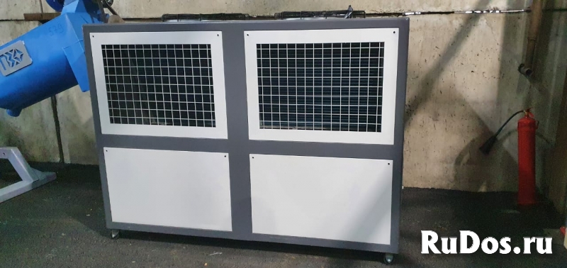 Чиллеры с воздушным охлаждением конденсатора выпускаются в моноблочном исполнении, когда все элементы чиллера находятся в одном блоке, Хладопроизвод. (ккал/ч) -3786 ккал/час, Мощность компрессора-10 кВт, Объем воздуха-26640 м3/ч, производительность - 43786 ккал/час